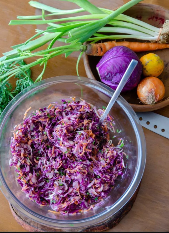Fatie o repolho, a cenoura e a cebola, o Alho poró no processador ou no mandolin ou na faca finamente,