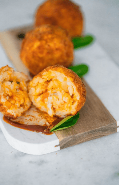 Em seguida, feche o arroz ao redor do recheio, cubra com mais arroz e forme uma bolinha.