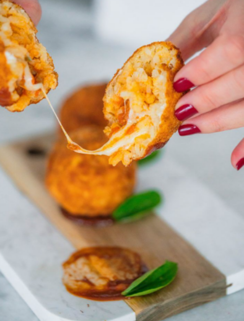 Agora, enrole o arancini na farinha de trigo. O ideal é colocar em um pote cheio de farinha e jogar mais por cima para não desmontar.