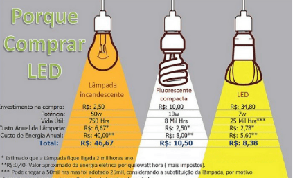 01 Lâmpada incandescente 60 W pode ser substituída por 01 lâmpada a LED de 4,5 W com economia de 55,5 W/hora.